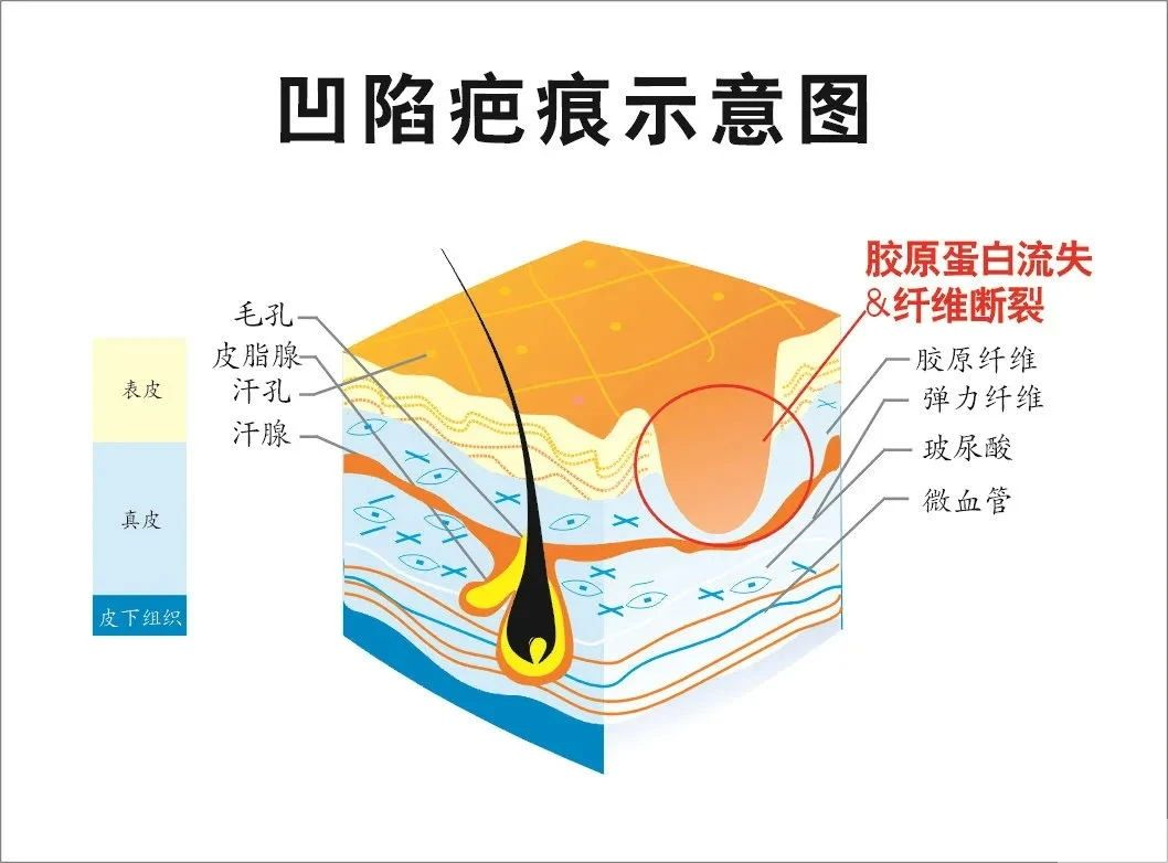凹陷性疤痕是由于皮肤真皮层及皮下组织缺损,从而导致愈合过程过中胶原蛋白缺失而留下的疤痕。