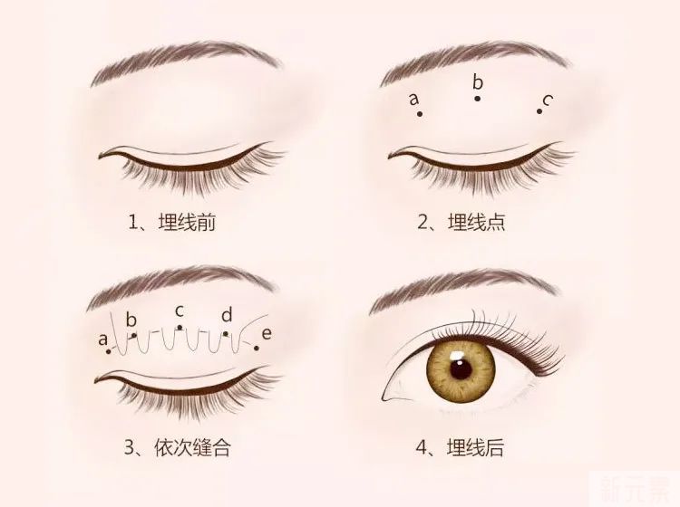 埋线双眼皮术式相对简单,在上眼睑皮肤切开3-5个小口,穿线缝合,通过打结形成一道褶皱(重睑线)。